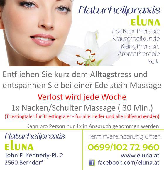 Herzlichen Dank an die Firma ELUNA aus Berndorf, die sich bereit erklärt hat, einmal in der Woche eine Edelsteinmassage an einen Triestingtaler zu spenden.